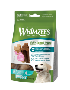 - 퍼피를 위한 윔지스는 부드럽고 젠틀하게 어린 강아지들의 플라그와 치석 제거에 도움을 줍니다.